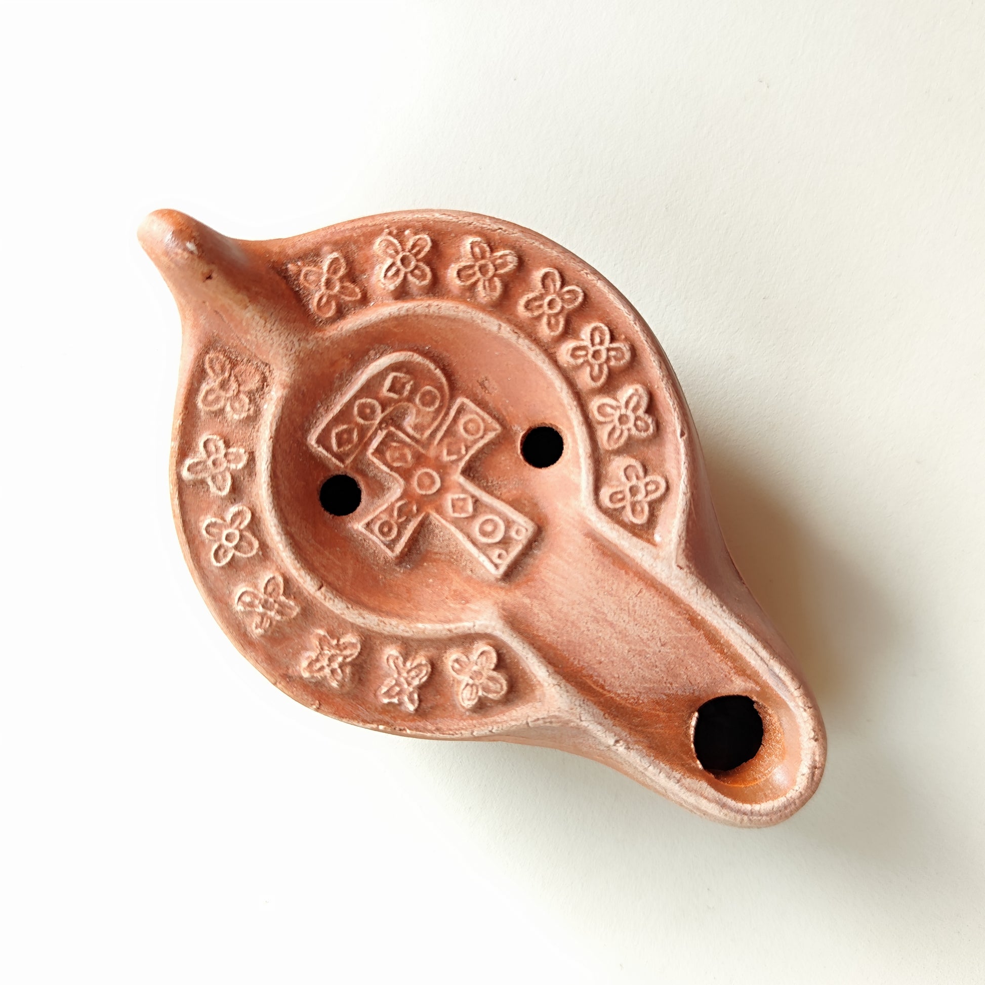 Geschichte: Hayes II-Form, hergestellt in Werkstätten in Nordafrika während des späten Römischen Reiches. Das Chrismon symbolisierte nach Konstantins Bekehrung göttlichen Schutz. Diese Lampen wurden mit Olivenöl und einem Docht aus Flachs oder Pflanzenfasern betrieben.