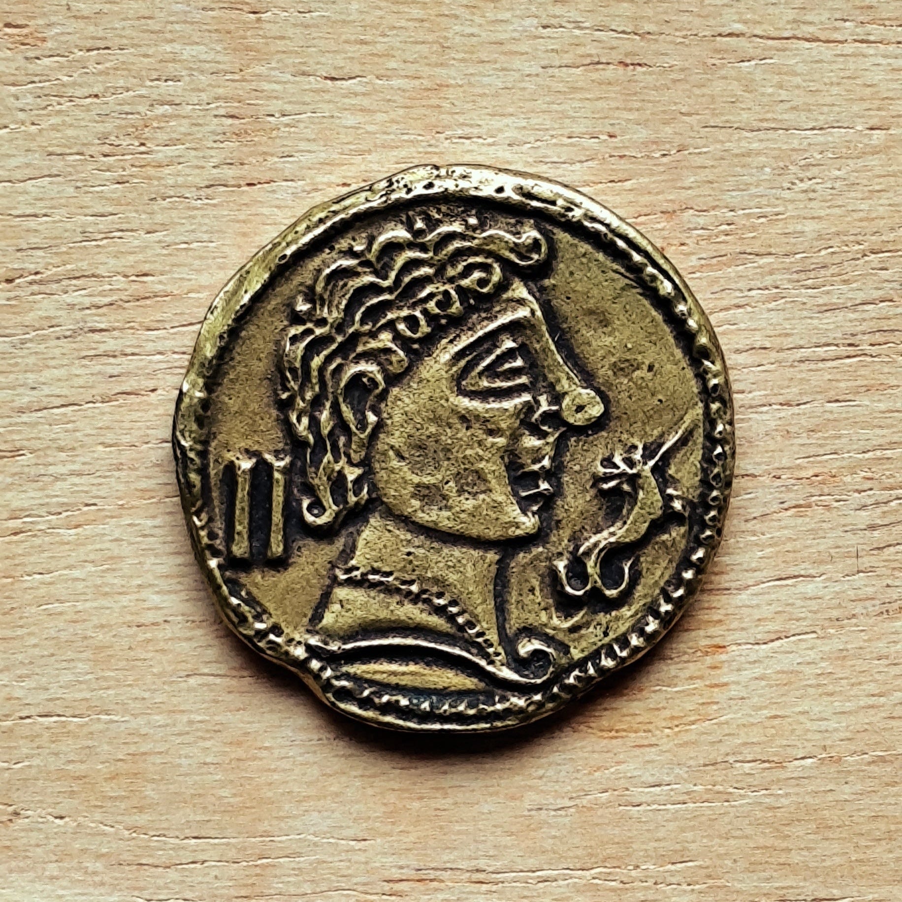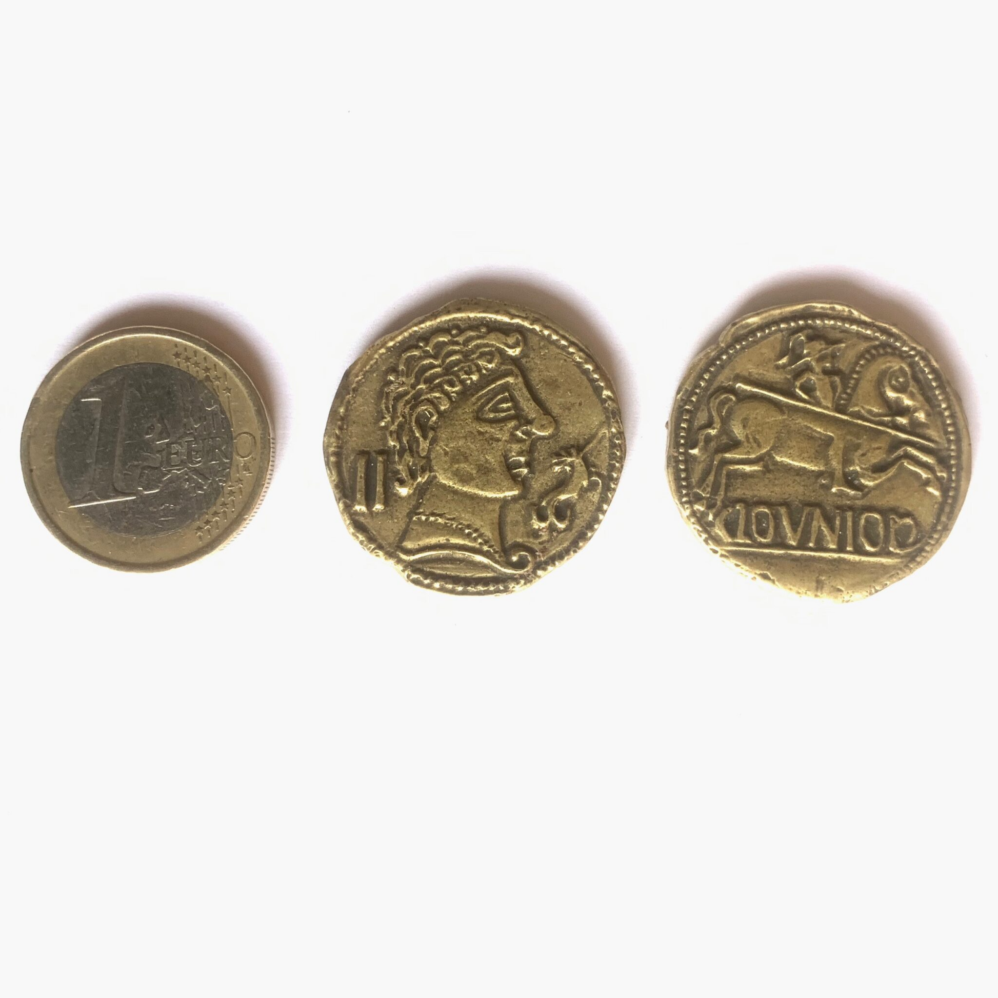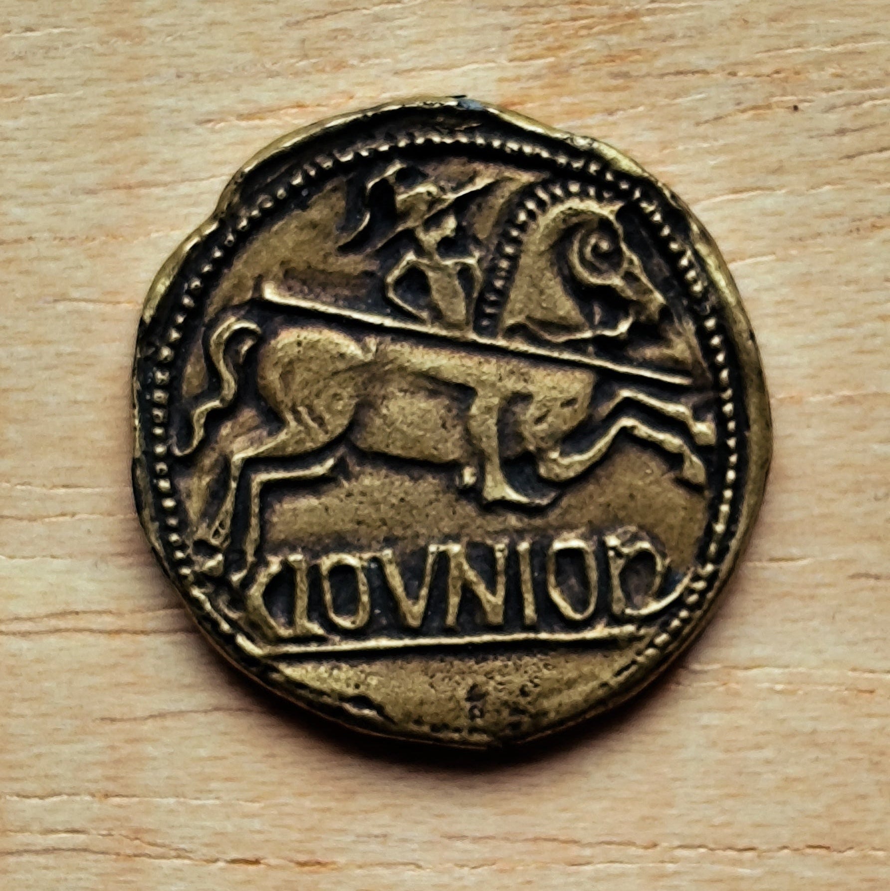 Reproducción de un As de Clunia (moneda iberorromana, siglo I a.C.) Acuñado a partir de un As de bronce con un busto viril en el anverso y un jinete lancero a derecha con leyenda ibérica CLOUNIOQ debajo (KOLOUNIOKU)