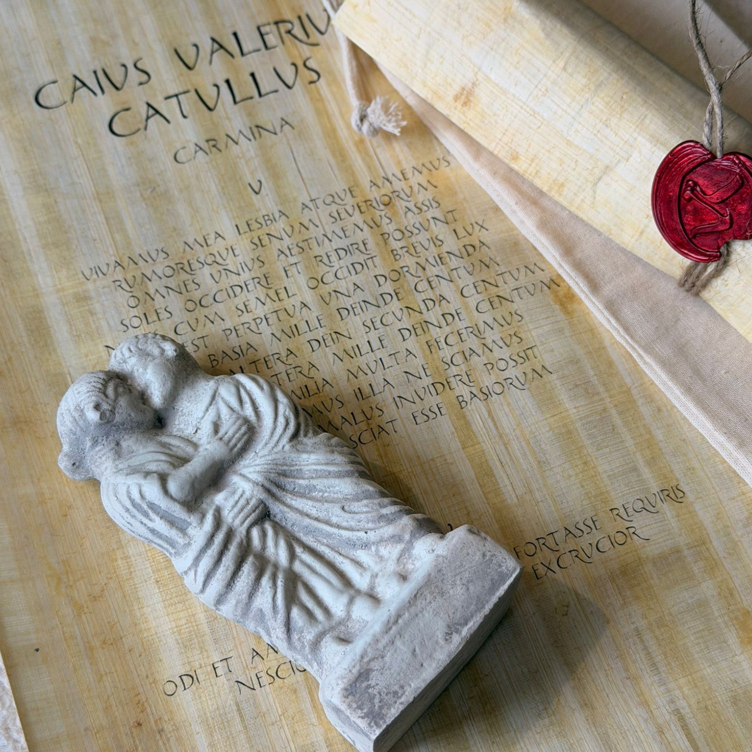 - 1 papiro con 2 poemas de Catulo (Incluye el cierre de lacre reutilizable y una bolsa de algodón)